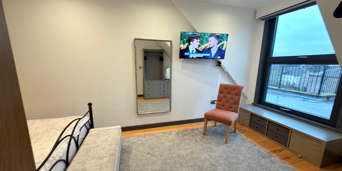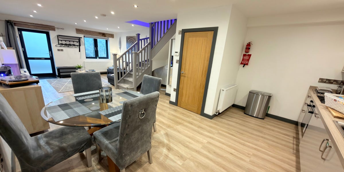 A truly spectacular luxury cottage set in the heart of the old chapel, featuring original soaring chapel windows and the original chapel doors at the entrance. A spiral staircase with a grand chandelier leads to the mezzanine level, where a sumptuous super king-size bedroom and lavish bathroom await, complete with a double jacuzzi bath, overhead shower, and his-and-hers sinks. Downstairs offers a generous living area with a sofa bed, TV, electric fire, and classic Street Fighter arcade machine, alongside a fully equipped kitchen with breakfast bar and a large dining table. Thoughtfully designed throughout, it combines historic charm, modern luxury, and playful touches for an unforgettable, home-from-home stay.
